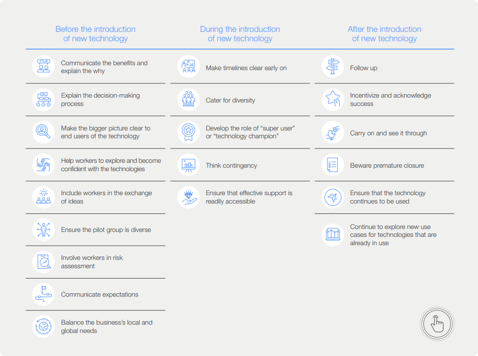 To maximize benefits and minimize risks, it is essential to adopt a people-centered approach, especially shop floor workers, who are the main users of these technologies.