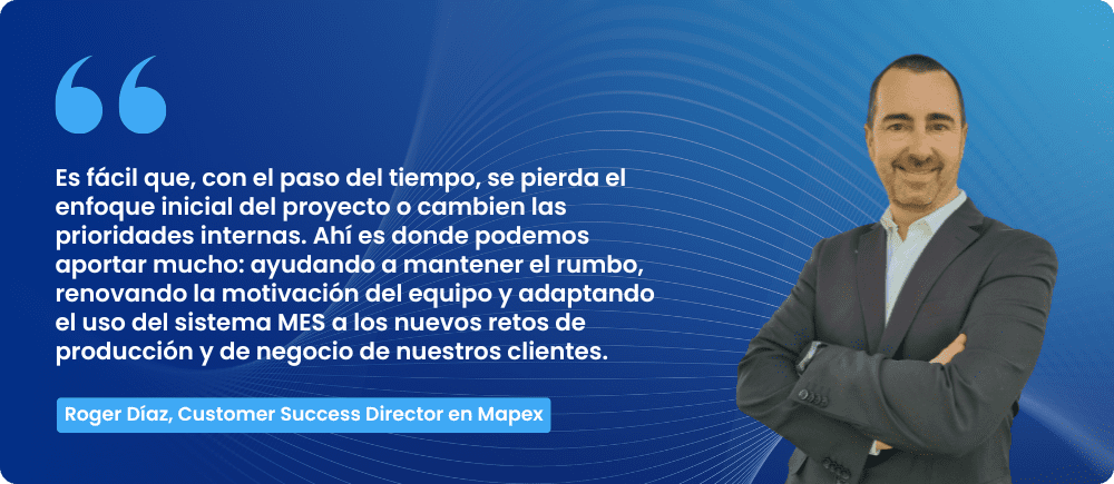 Tras 15 años liderando las áreas de Implementación y Producto en Mapex, Roger Díaz asume ahora la dirección de un nuevo equipo: Customer Success. Una iniciativa que nace con la idea de estar más cerca de los clientes, acompañarlos en su proceso de digitalización y ayudarles a obtener todo el potencial de la plataforma MES.